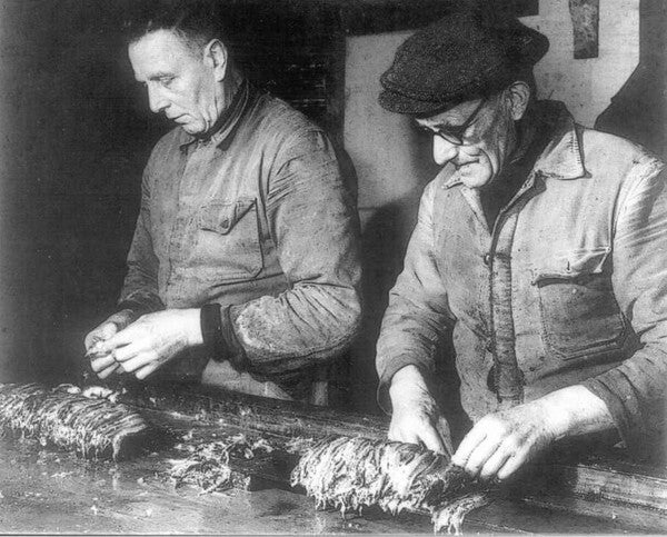 Bij de rokerij van vishandelaar Poppe de Rook. Tiesse de Rook links achter de mannen met de vis aan speten. Poppe rechts met de hoed.