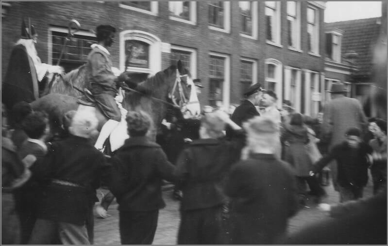 Twee foto's van Betty Wienia: Optocht Sinterklaas & Zwartepiet, voorbij de Wildeman de Nieuwedijk in.