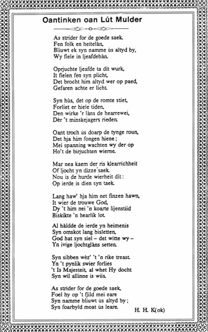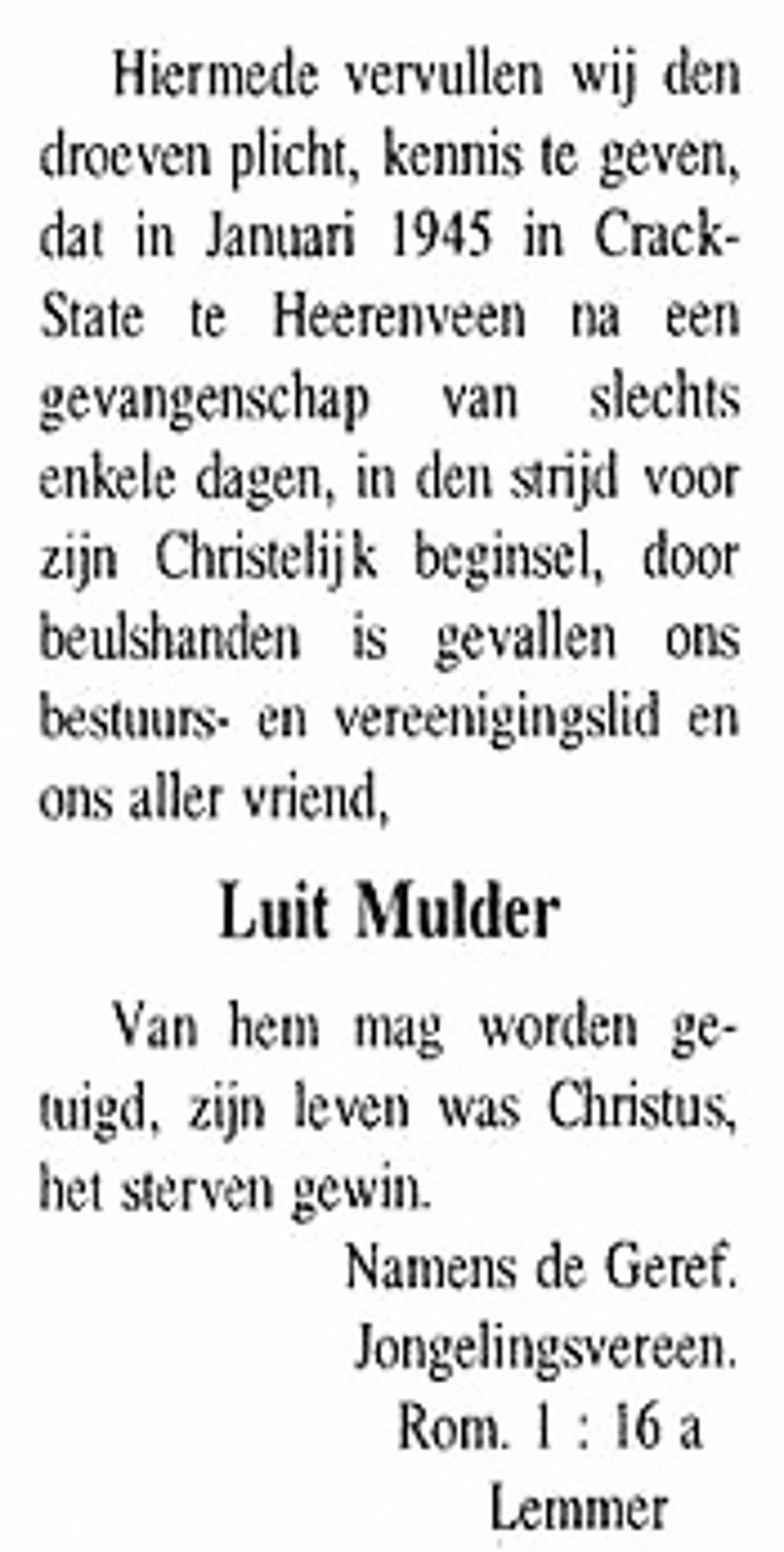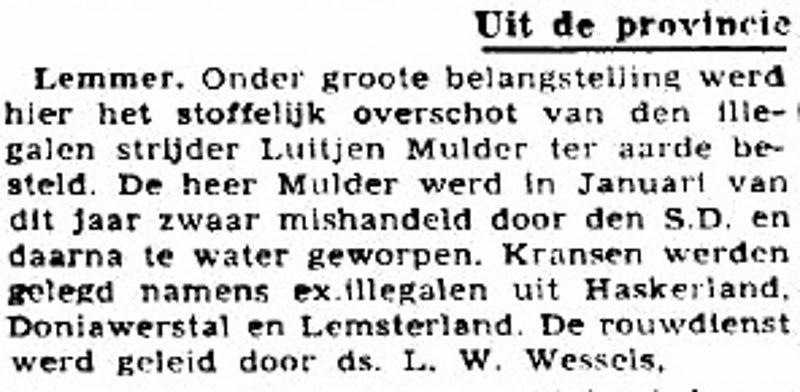 LEMMER. Dinsdagmiddag werd, onder groote belangstelling, het stoffelijk overschot van Luitjen Mulder, ter aarde besteld. De in de gereformeerde kerk gehouden rouwdienst werd geleid door Ds. L.W.Wessels, die sprak naar aanleiding van 2 Sam. 1 het slot.