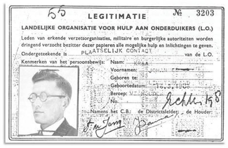 Het LO-legitimatiebewijs van Johannes Kraak. Zijn schuilnamen waren 'Johannes van der Veen' en 'Jan Bosman'.